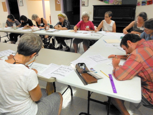 Book Arts Guild of Vermont members practicing calligraphy